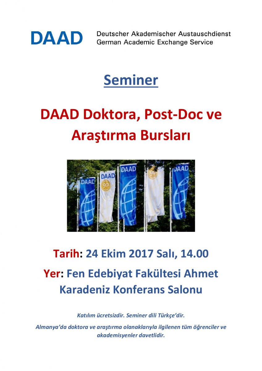 Almanya’da doktora ve araştırma olanakları ile burs imkanları hakkında detaylı bilginin verileceği “DAAD Doktora, Post-Doc ve Araştırma Bursları” konulu seminer 24 Ekim 2017 Salı günü saat 14:00’da Fen-Edebiyat Fakültesi Ahmet Karadeniz Konferans Salonunda gerçekleşecektir.